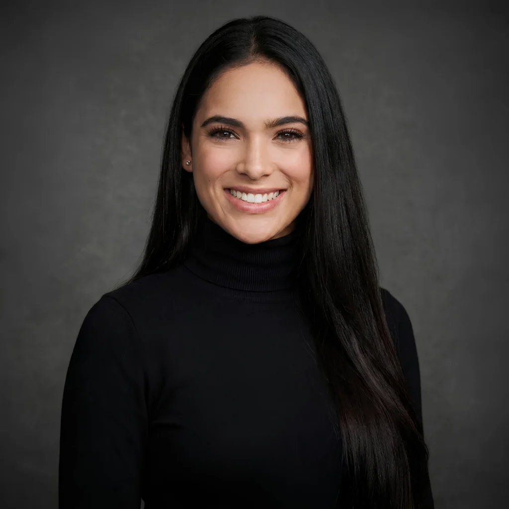 A professional portrait of a smiling asian woman in a black blazer and white shirt, set against a muted gray background.