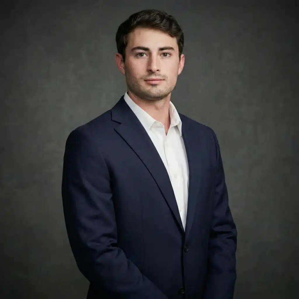 A confident man in a dark grey blazer and white shirt, smiling lightly, with a clean background. he appears approachable and professional.